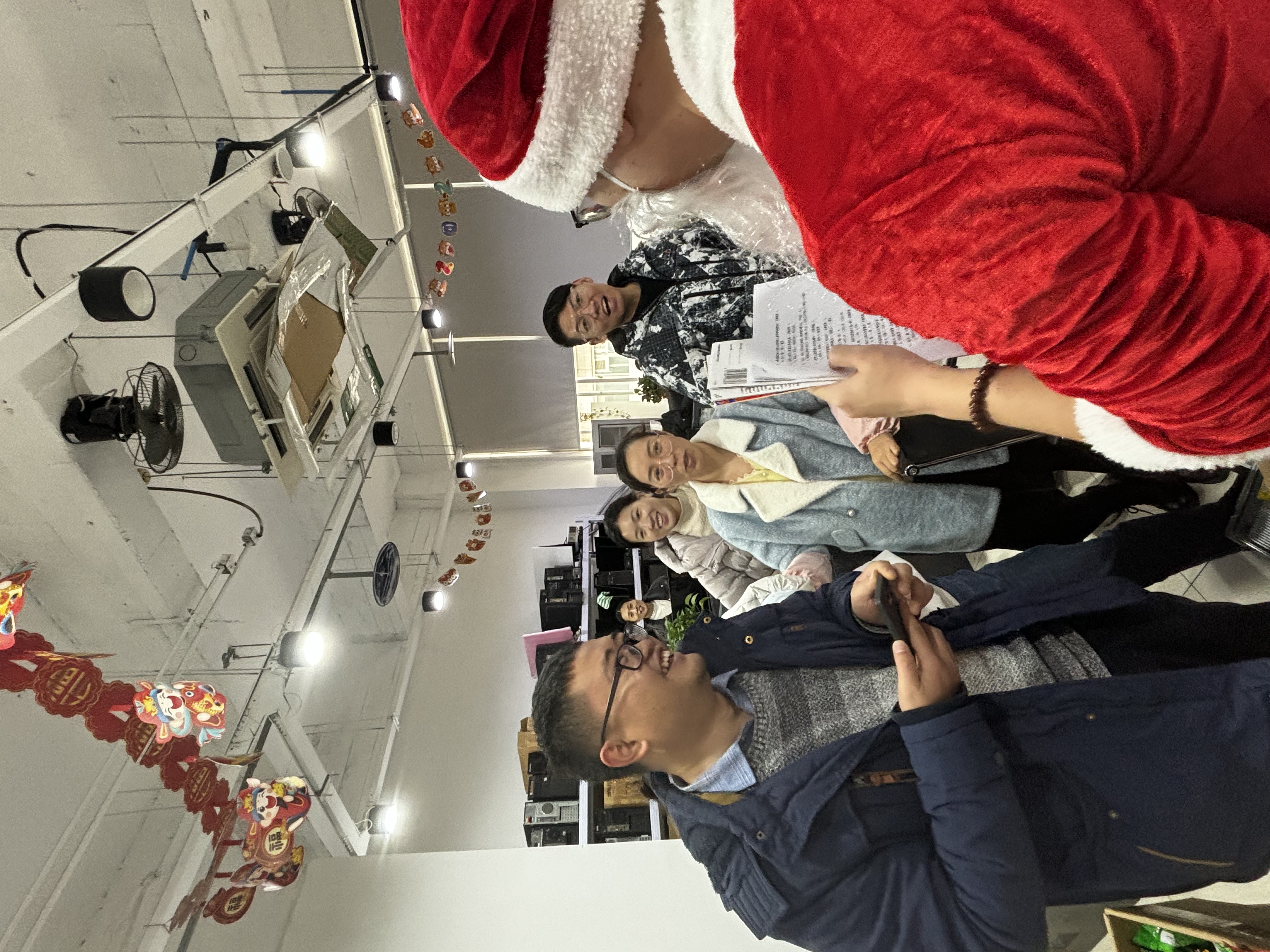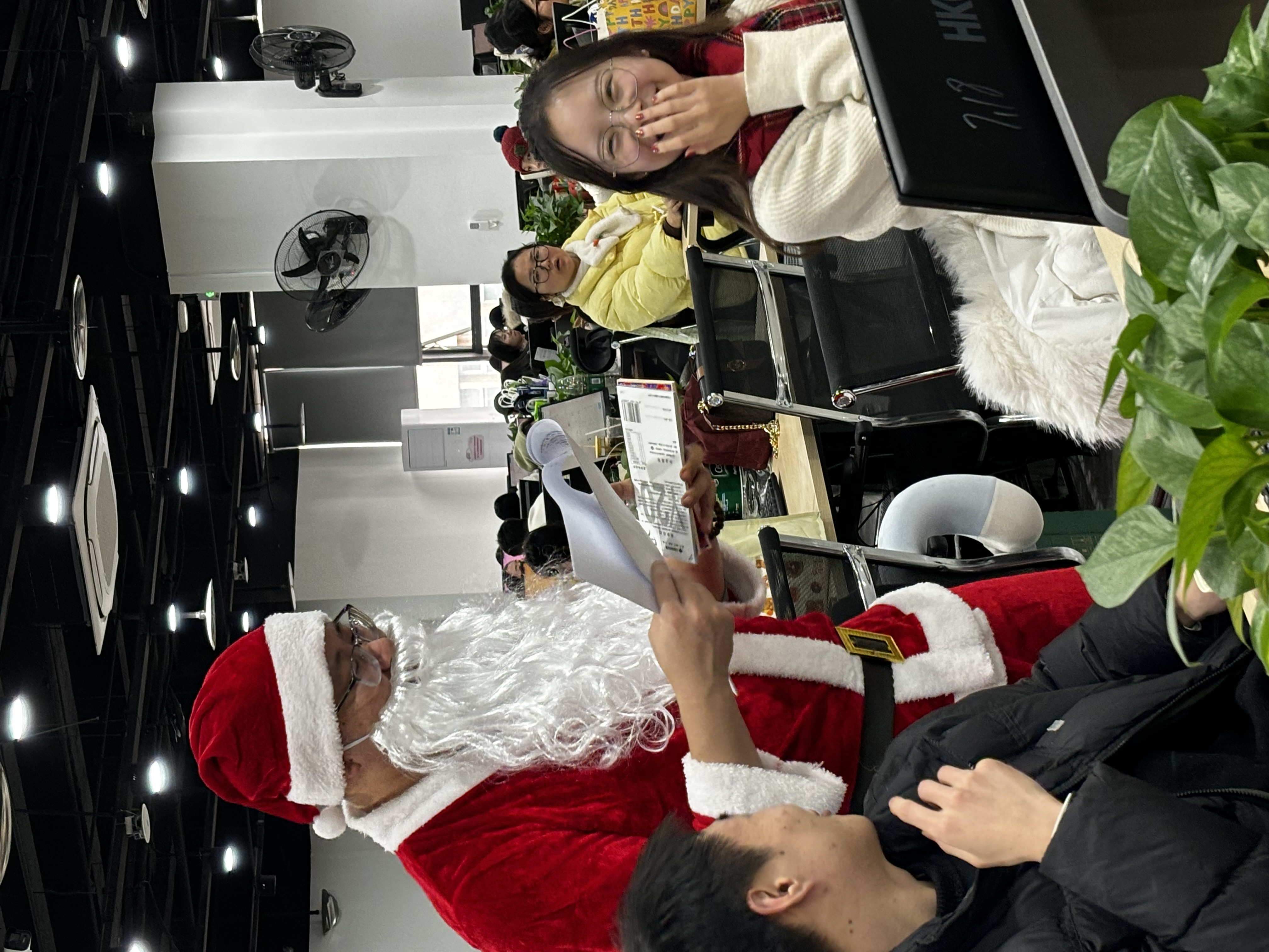 活动筹备阶段,行政团队提前精心布置了各问答站点,可爱的圣诞装饰、闪烁的彩灯与温馨的标语,将职场打造成充满节日气息的欢乐天地。本次活动创新采用“巡回互动”模式,由装扮成圣诞老人的工作人员携带问答题库与丰厚礼品,依次前往各部门、各办公区域,员工无需集中参与,在工位附近即可随时加入答题,极大提升了活动的参与便捷性。